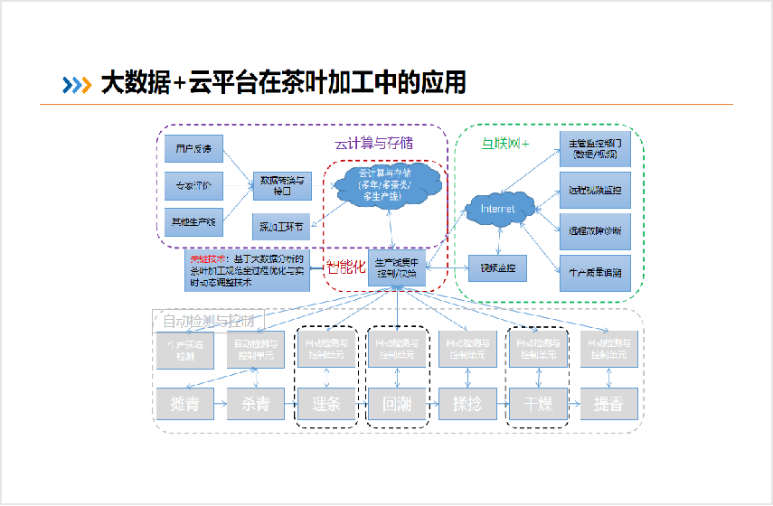 控制系統(tǒng)通過對茶葉加工生產(chǎn)線數(shù)字化管理與數(shù)據(jù)處理技術的研究,進一步提升茶葉加工生產(chǎn)線的數(shù)字化管理水平,并通過加工品質(zhì)在線監(jiān)測與反饋實現(xiàn)一葉一策的加工模式,通過加工大數(shù)據(jù)的處理與分析為工藝優(yōu)化與設備改進提供支撐。