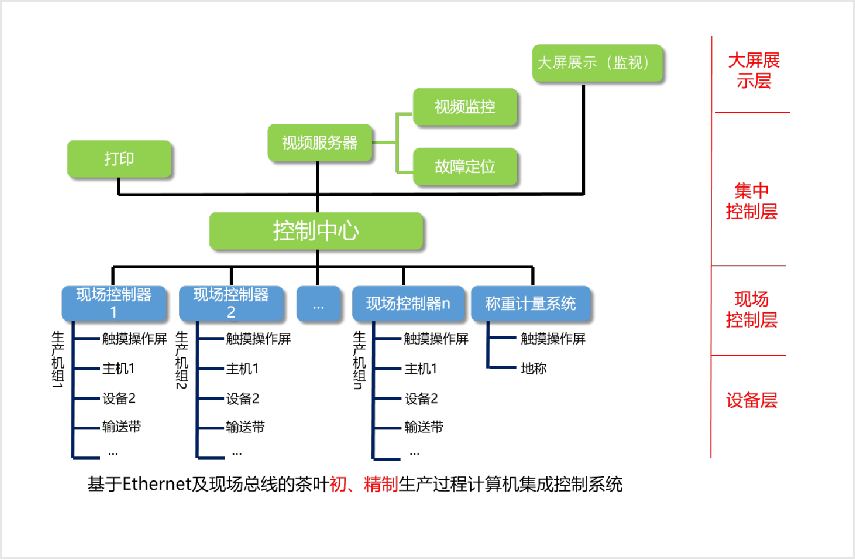 控制系統(tǒng)采用網(wǎng)絡技術及現(xiàn)場總線技術,分為大屏展示(監(jiān)視)層、集中控制層、現(xiàn)場控制層和設備層共四級。系統(tǒng)通過網(wǎng)絡,將現(xiàn)場控制單元進行互聯(lián),將所有數(shù)據(jù)集中到總控計算機上,從而形成對整條生產(chǎn)線的控制以及生產(chǎn)參數(shù)與報表的匯總,并把相關的展示信息和畫面監(jiān)控信息投送大屏展示層,具備傳輸信號容量大、實時性強的特點。